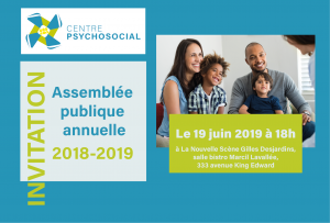 Le Centre Psychosocial vous invite a assister a son AGA qui se tiendra le mercredi 16 juin 2019 à La Nouvelle Scène Gilles Desjardins, salle bistro Marcil Lavallée, 333 avenue King Edward.